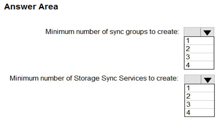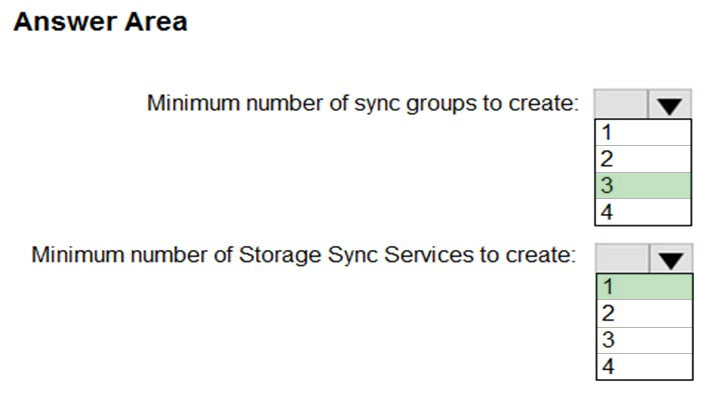 Sync to FS1, FS2 and both so 3 sync groups Sync groups are deployed into Storage Sync Services, which are top-level objects that register servers for use with Azure File Sync and contain the sync group relationships So min 1 sync service Answer is correct
