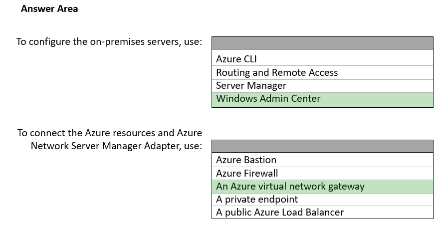 On-Premises: Install Windows Admin Center and configure Azure Network Adapter. Azure: Create an existing virtual network gateway