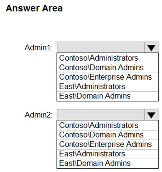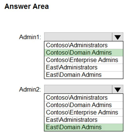 Why not, Enterprise Admins? It's important to follow the principle of least privilege when assigning permissions.This helps to minimize the potential for damage if an account is compromised. To ensure that users can perform the tasks mentioned, you must add each user to the following group: Admin1: You must add Admin1 to the ContosoEnterprise Admins group. This group has permissions to create and manage Active Directory sites throughout the forest. Admin2: You must add Admin2 to the EastDomain Admins group. This group has permissions to deploy domain controllers in the east.contoso.com domain. Just a doubt, these questions of the test are quite confusing.