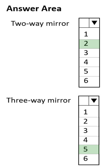 2 and 5 https://learn.microsoft.com/en-us/training/modules/implement-storage-spaces-storage-spaces-direct/2-define-storage-spaces-architecture-components Resiliency levels To create a highly available virtual disk, you need at least one physical disk that satisfies the following requirements: 1.One physical disk is required to create a storage pool. 2.A minimum of two physical disks are required to create a resilient mirror virtual disk. 3.A minimum of three physical disks are required to create a virtual disk with resiliency through parity. 4.Three-way mirroring requires at least five physical disks. 5.Disks must be blank and unformatted. No volume can exist on the disks.
