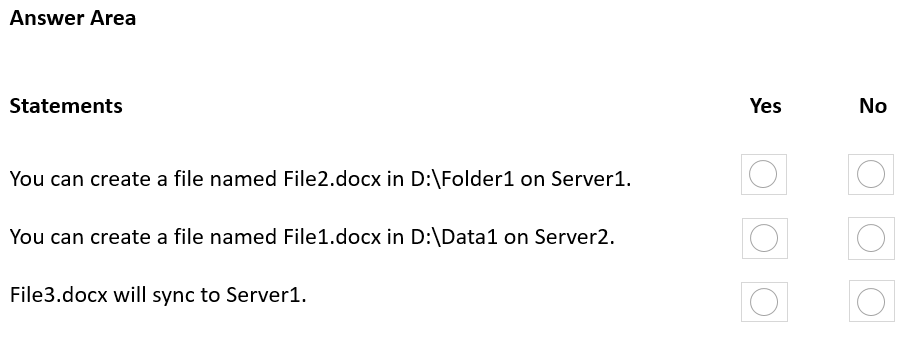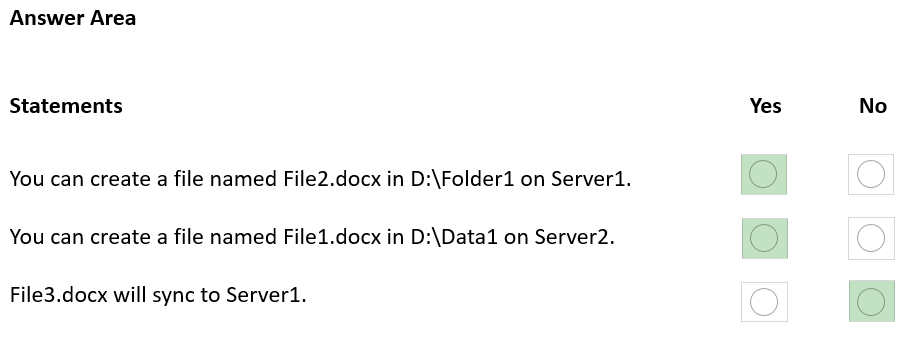 I'm sorry. The correct answer is: You can create a file named File2.docx in D:\Folder1 on Server1: No (already exists due to synchronization) You can create a file named File1.docx in D:\Data1 on Server2: No (already exists due to synchronization) File3.docx will sync to Server1: Yes (will sync from share1 to D:\Folder1 on Server1)
