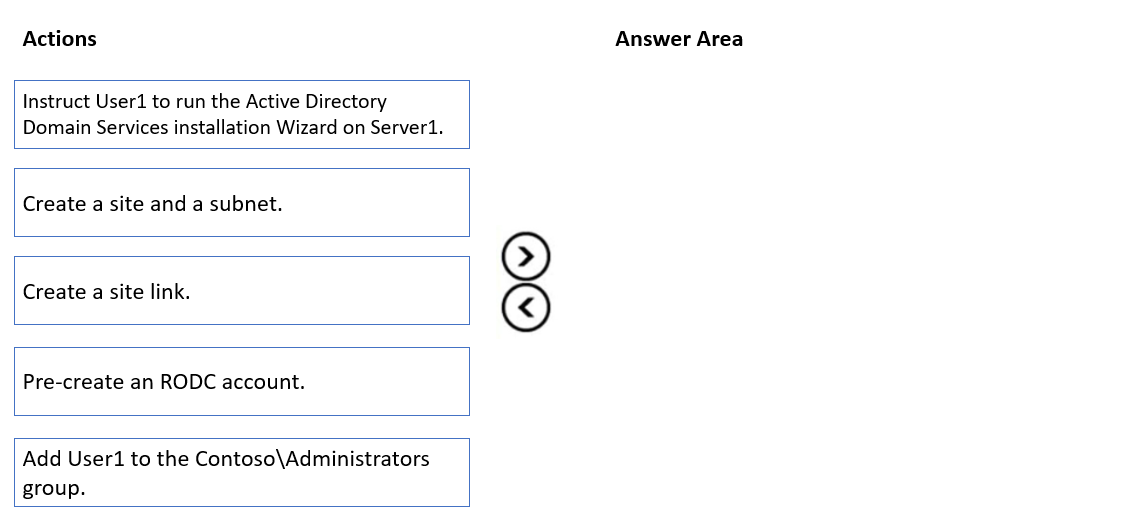 Correct Answer: 1. Create Site & Subnet 2. Add User1 to "contoso\administrators" 3. Instruct User1 to Run Active Direcotry Domain Services Installation Wizard on Server1. - Pre-create RODC account: -> this is not a valid answer, since user 1 also needs to be a domain admin.
