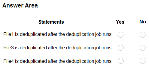 - File1 is deduplicated after the deduplication job runs: Yes (its size is greater than 32 KB and it is located on volume D with deduplication enabled). - File3 is deduplicated after the deduplication job runs: No (it was moved to volume E where deduplication is not enabled). - File4 is deduplicated after the deduplication job runs: No (its size is less than 32 KB and it will be skipped by deduplication).