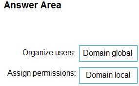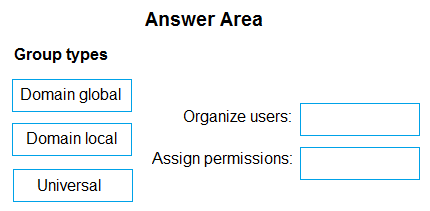 Which type of groups should you use to organize the users and to assign permissions? To answer, drag the appropriate group types to the correct requirements. Each group may be used once, more than once, or not at all. You may need to drag the split bar between panes or scroll to view content.