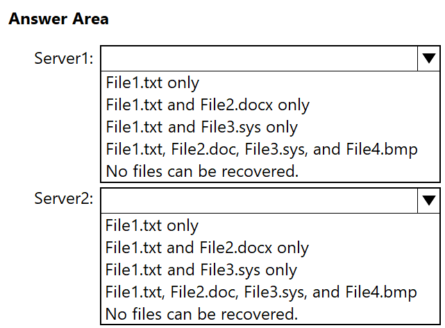 Which files can you recover if you attach Disk1 to Server1, and which files can you recover if you attach Disk1 to Server2? To answer, select the appropriate options in the answer area.