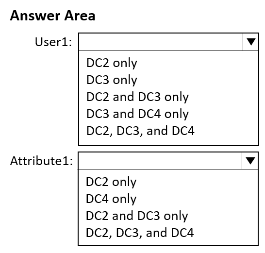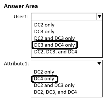 User1: DC2 and DC3 only Reason: User1 replicates within adatum.com (DC2) and to GC servers in the same forest (DC3) Attribute1: DC2 and DC3 only Reason: Schema changes replicate to all DCs within the same forest only