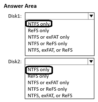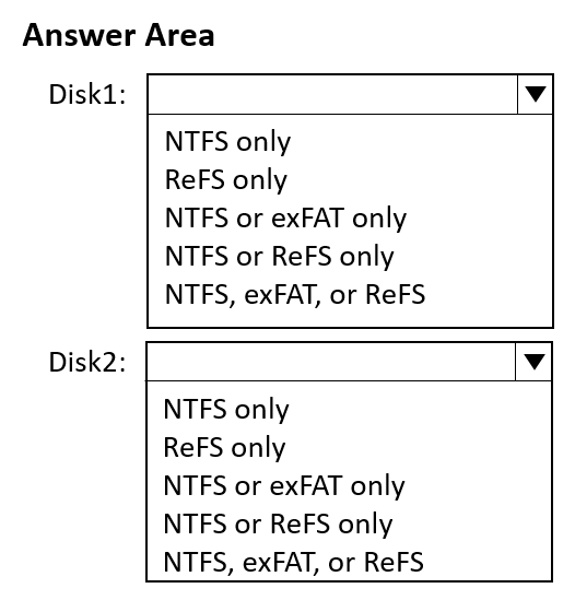 To meet the requirements for each disk, you should use the following file systems: Disk1 (must support disk level quotas): NTFS only (NTFS supports disk quotas) Disk2 (must support Data Deduplication): NTFS or ReFS only (both NTFS and ReFS support Data Deduplication, but NTFS is more commonly used for this purpose)