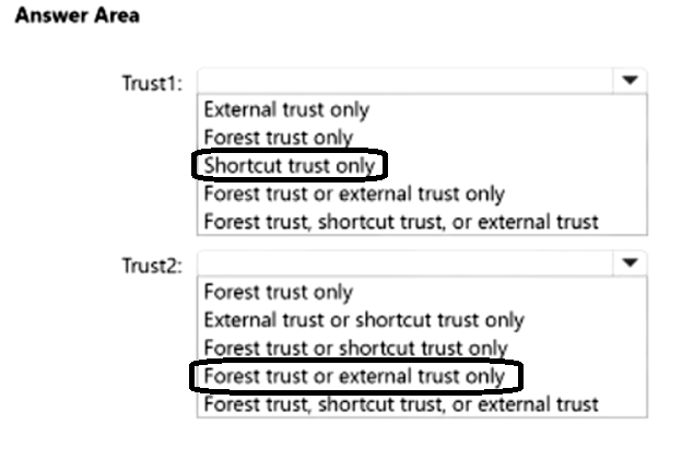 Answer is correct Trust 1: Shortcut Only Trust 2: Forest Trust or External Trust