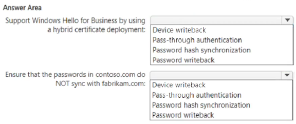 Ensure that the passwords in contoso.com do NOT sync with fabrikam.com: Pass-through authentication. This feature allows users to authenticate using their on-premises passwords without syncing the password hashes to Microsoft Entra ID. https://learn.microsoft.com/en-us/entra/identity/hybrid/connect/how-to-connect-pta