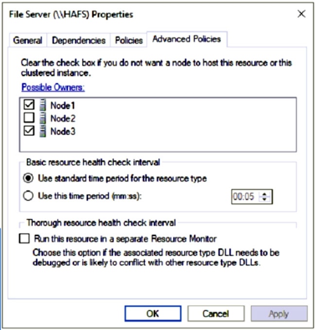 Correct Y, Y, N The first 2 question is straightforward. The last question is tricky: The Advanced Policies tab - Possible Owners meaning: https://forsenergy.com/en-us/cluadmin/html/8e1c1455-2f8b-400d-a6f8-378c8d7f4f7a.htm "Clear the check box for a node only if you want to prevent this resource (and the clustered service or application that contains this resource) from failing over to that node. Otherwise, leave the boxes checked for all nodes. Note that if you leave the box for only one node checked, this resource (and the clustered service or application that contains this resource) cannot fail over." As Node2 is not checked the cluster will never fail over to Node2, even if you try Move -> Select Node -> Node2. So the 3rd question is NO.