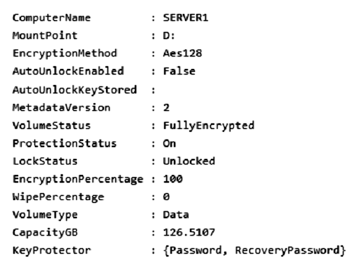 You run Get-BitLockerVolume -MountPoint C,D | fl *, which generates the following output.