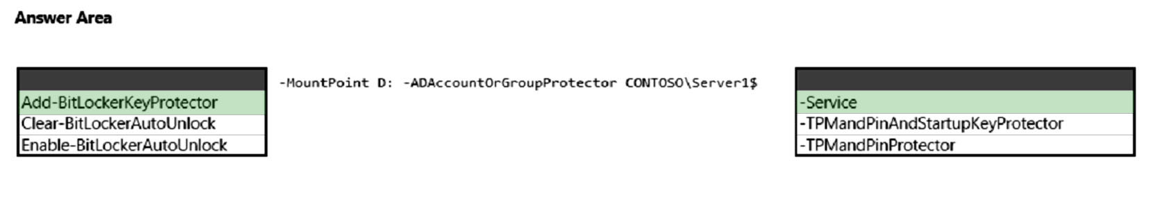 https://learn.microsoft.com/en-us/powershell/module/bitlocker/add-bitlockerkeyprotector?view=windowsserver2022-ps -Service Indicates that the system account for this computer unlocks the encrypted volume. Answer is right