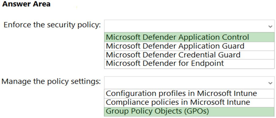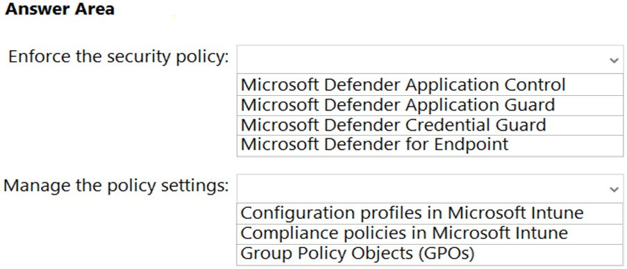 Which service should you use to enforce the security policy, and what should you use to manage the policy settings? To answer, select the appropriate options in the answer area.