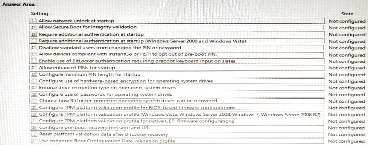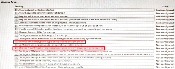 "enable BitLocker Drive Encryption (Bit-Locker) on volume C " Enforce drive encryption type on operating system drives would address this I guess