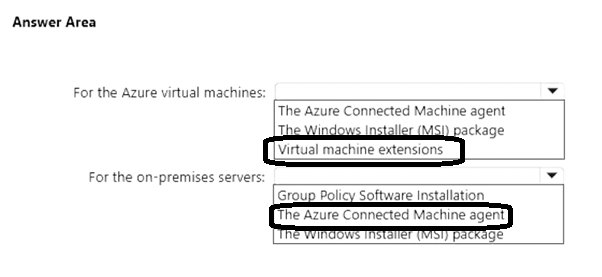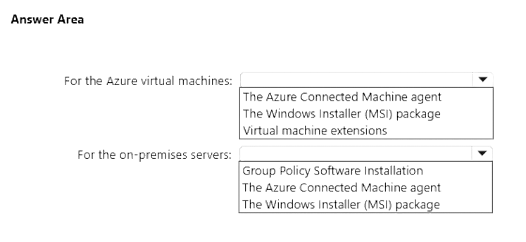 Azure Virtual Machine = Virtual Machine Extensions On-Primise machine = Windows Installer (MSI) https://learn.microsoft.com/en-us/azure/azure-monitor/agents/azure-monitor-agent-windows-client