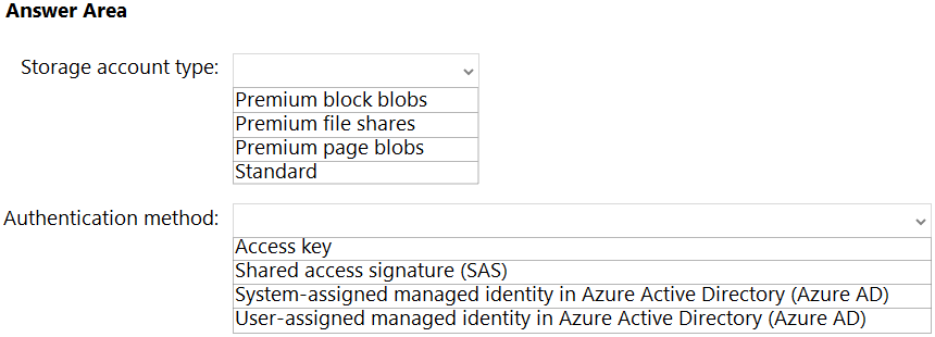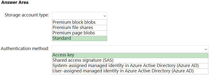 Which storage account type and authorization method should you configure? To answer, select the appropriate options in the answer area.