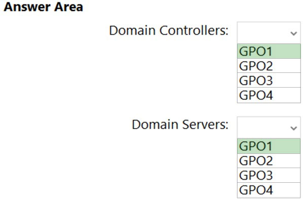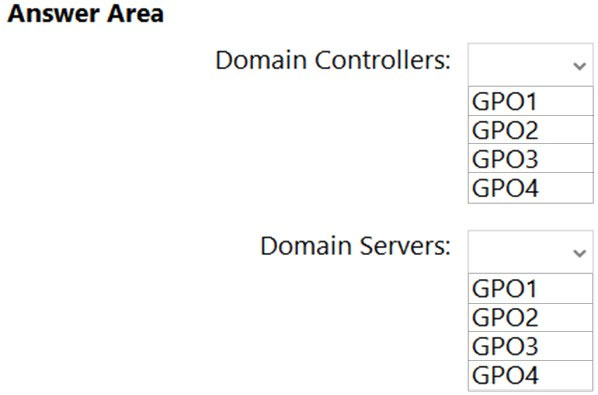 Which GPOs should you apply to the Domain Controllers OU and the Domain Servers OU? To answer, select the appropriate options in the answer area.
