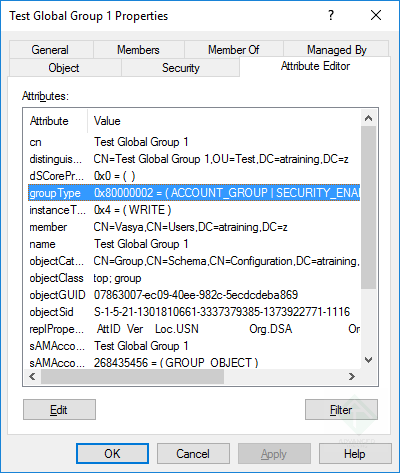 У той же самой группы, которую переключили в Distribution-режим, этот бит атрибута groupType сбросился, а SID остался(кликните для увеличения до 400 px на 473 px)