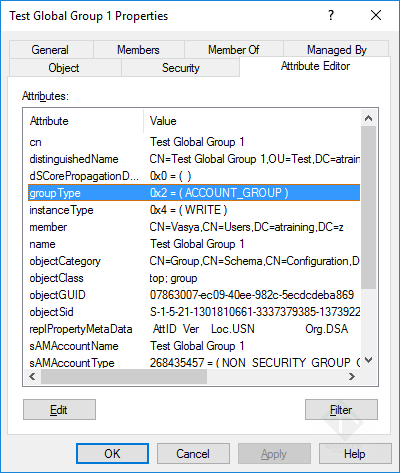 Как отличить эти два типа групп? Исключая, конечно, то, что мне было лень писать description к тестовой группе, и она выделяется по этому признаку? Всё просто – у этих двух типов групп разные форматы SID’ов: