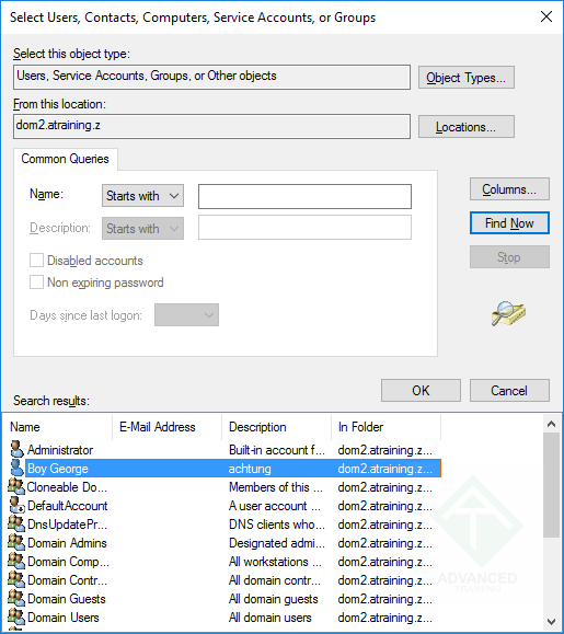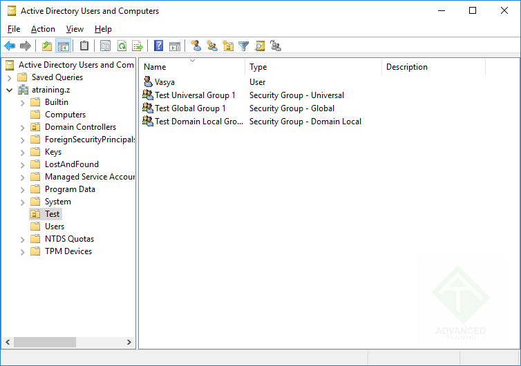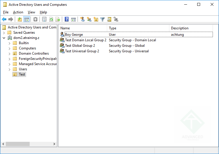 Проверим на практике. Исходные данные – корневой домен леса atraining.z и его дочерний домен с удручающим названием dom2.atraining.z. В каждом из доменов создано 3 тестовых группы разных видов и по одному пользователю: