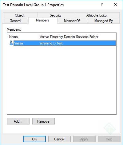 В Domain Local-группе у нас будет одинокий местный участник Vasya: