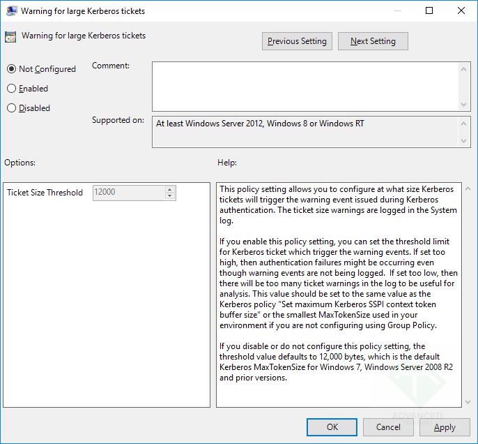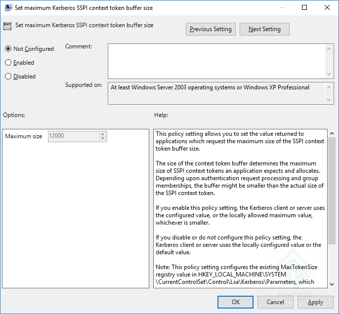 Поэтому операционная система, в частности встроенный в неё модуль поддержки Kerberos, имеет настройку, ограничивающую максимальный размер содержимого. Исторически этот размер, появившись в Windows 2000, был 8.000. В Windows 2000 Service Pack 2 он стал 12.000, а с Windows Server 2012 – 48.000. Вы можете его поправить, если что, простой настройкой параметра MaxTokenSize, который сейчас уже есть в стандартных групповых политиках (я предполагаю, что вы обновляете административные шаблоны у себя в домене):