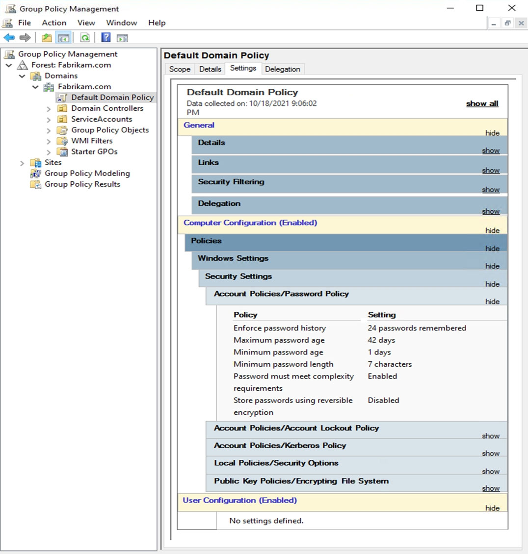 The Default Domain Policy Group Policy Object (GPO) is shown in the GPO exhibit. (Click the GPO tab.)