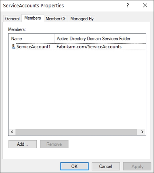 The members of a group named Service Accounts are shown in the Group exhibit. (Click the Group tab.)