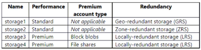 You have an Azure subscription. The subscription contains a virtual machine named VM1 that runs Windows Server. The subscription contains the storage accounts shown in the following table.