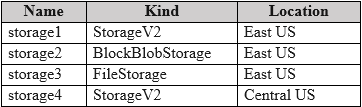 You have an Azure subscription. The subscription contains a virtual machine named VM1 that runs Windows Server and is in the East US Azure region. The subscription contains the storage accounts shown in the following table.
