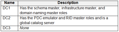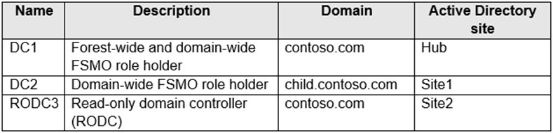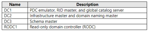 Your network contains an Active Directory Domain Services (AD DS) domain. The domain contains the domain controllers shown in the following table.