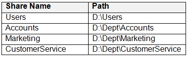 You have an Active Directory domain that contains a file server named Server1. Server1 runs Windows Server and includes the file shares shown in the following table.